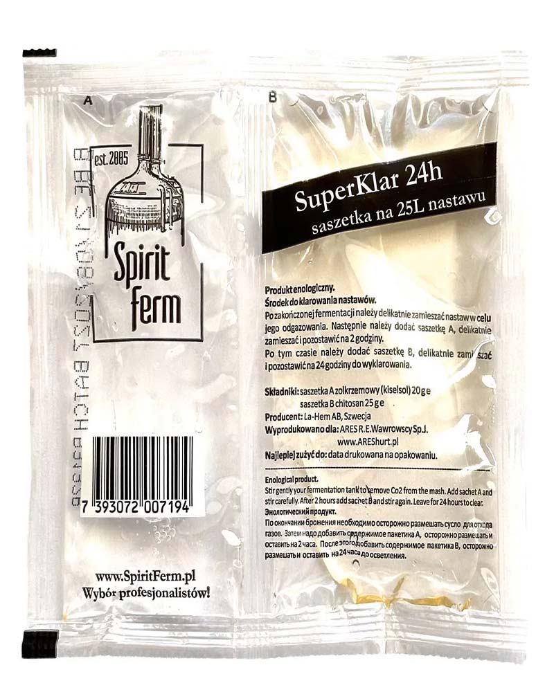 SpiritFerm SuperKlar 24h — это профессиональный двухкомпонентный осветлитель на основе хитозана, предназначенный для быстрого и эффективного удаления белковых, дрожжевых и других помутнений из сусла, браги, соков и продуктов брожения.
