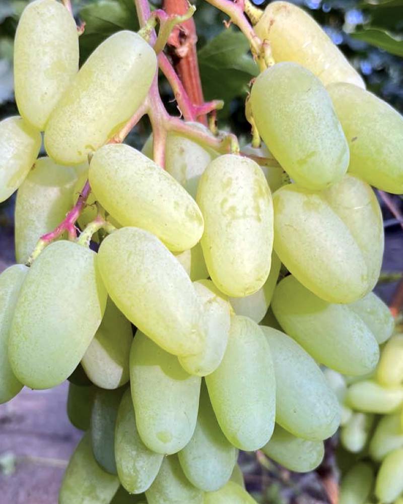 Ягоды имеют удлинённую пальчиковую форму и достигают длины до 4,5–5 см. Цвет ягод жёлтый с лёгким золотистым оттенком, на солнце появляется красивый загар. Мякоть мясистая, плотная и хрустящая, вкус гармоничный и сладкий, с лёгкими мускатными нотками на ранних стадиях созревания.
