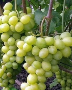 Грозди крупные, плотные, средней массой 800–1500 г. Ягоды округло-вытянутой формы, крупные (16–20 г), размером 38×28 мм, янтарно-жёлтые, мясистые, сочные и хрустящие, с гармоничным вкусом.